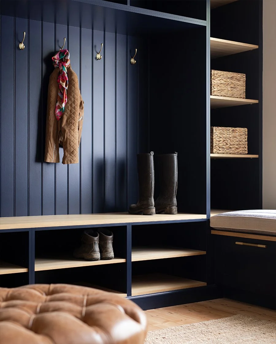 the boot room has plenty of storage spaces at different heights, helping to manage the wonderful chaos that generally accompanies small children and busy lives